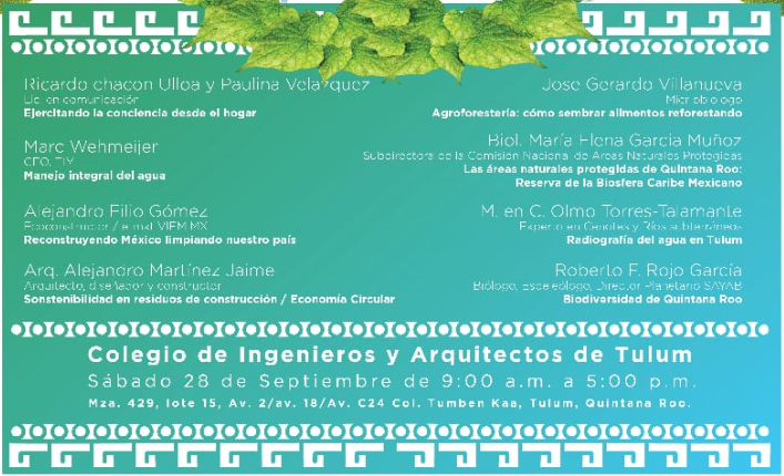 - Radiografía del agua en Tulum por M. en C. Olmo Torres-Talamante. Experto en cenotes y ríos subterráneos. Horario: 13:50 a 14:20 pm.