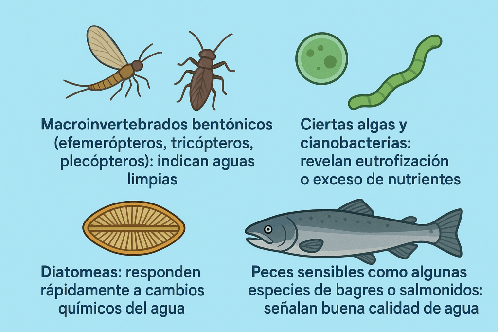 Porque los organismos acuáticos reaccionan directamente a los cambios en su entorno: contaminación, falta de oxígeno, variaciones de pH, metales pesados o alteraciones del hábitat.