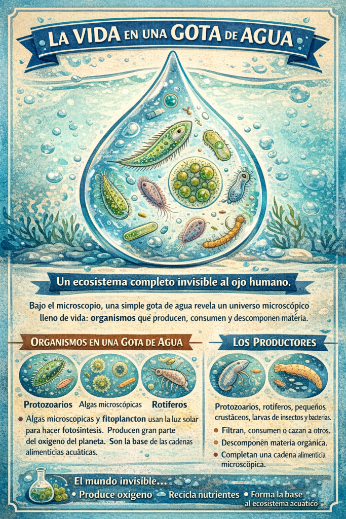 Pero si la observamos bajo un microscopio, descubrimos un universo completamente distinto: organismos que se mueven, cazan, se alimentan, se reproducen y compiten por sobrevivir.